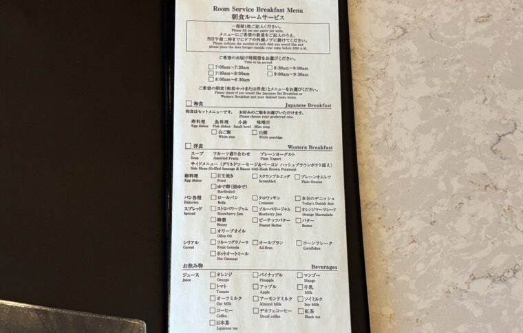 客室にある「朝食ルームサービス(紙)」に記入し午前2:00までに客室の外側のドアノブにかける仕組みでした。部屋へのデリバリーの時間帯も、自分の希望に合わせて選べるようになっています。